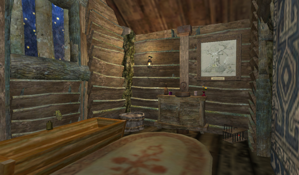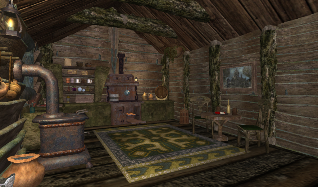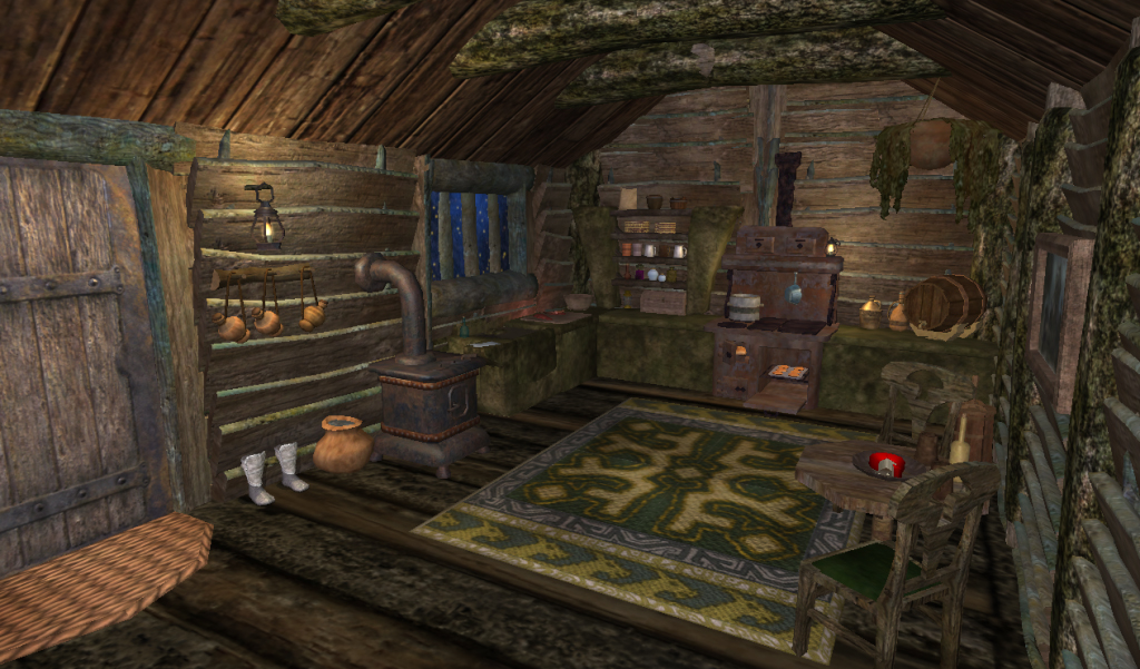 This house originally started out as a personal dojo, but was completely transformed into a rustic log cabin. It's a small place, with just the necessities for a stay out in the deep forest.