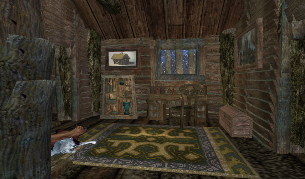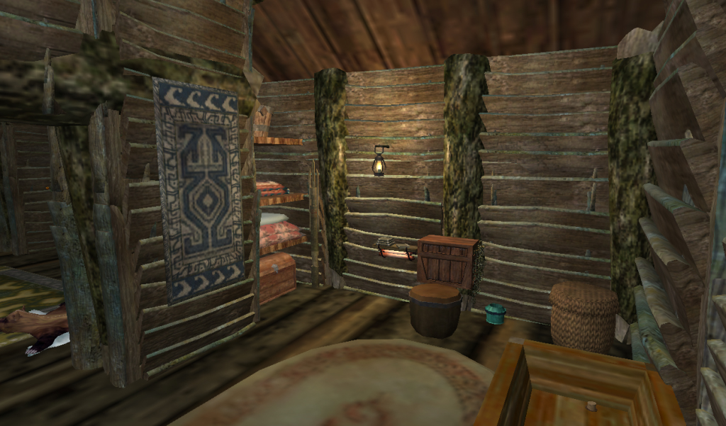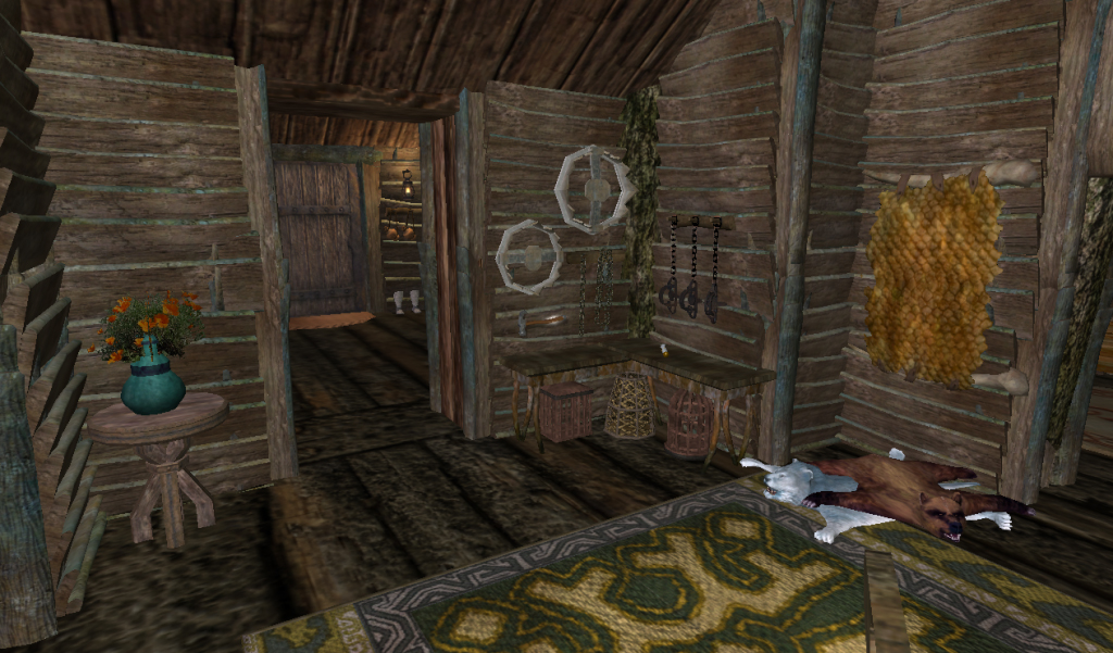 Looking back to the center doorway, you can see a worktable for building animal traps and drying pelts: